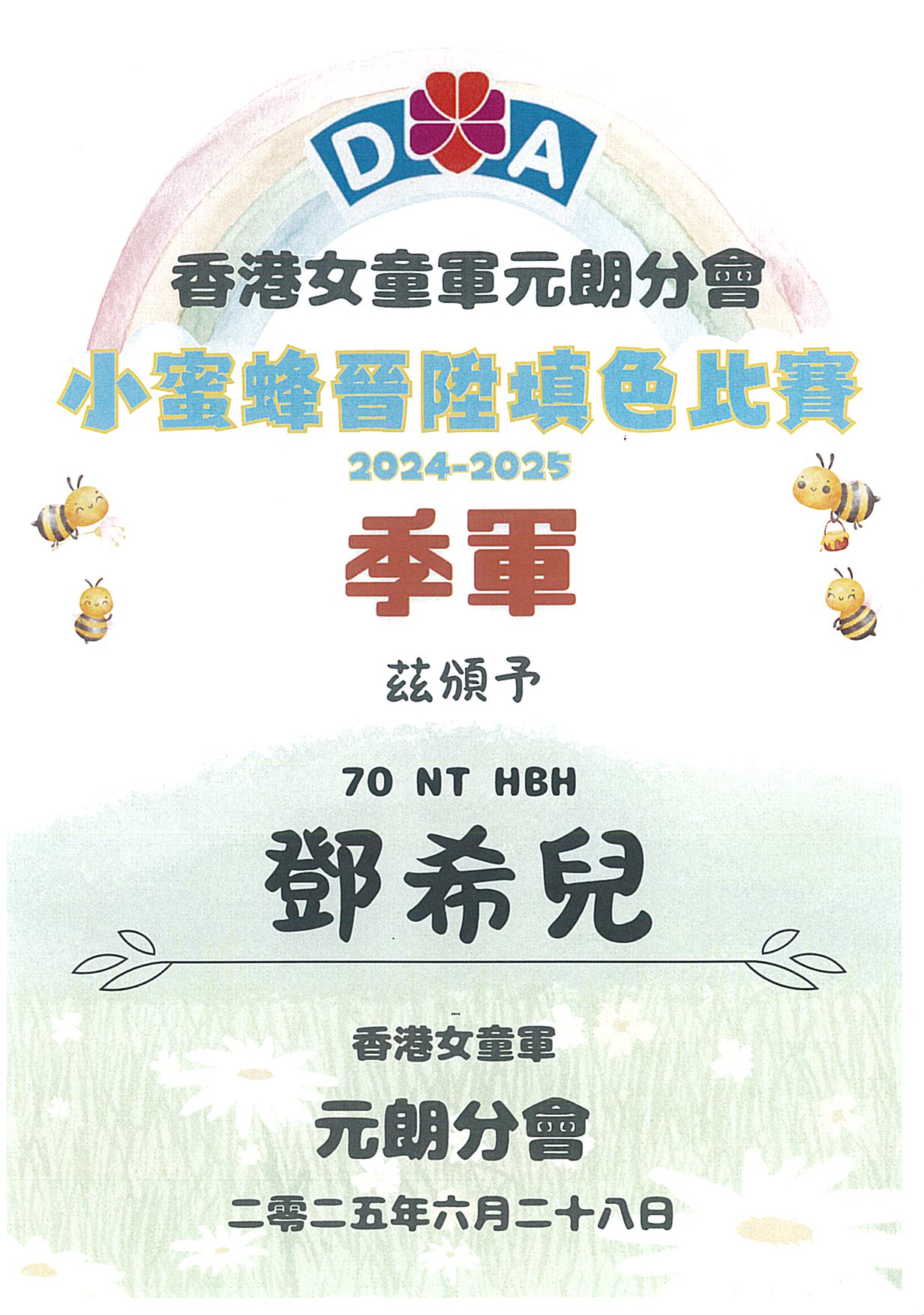 Up 香港女童軍元朗分會 2024-2025小蜜蜂晉陞填色比賽 正校70NT 得獎名單 Prev Next